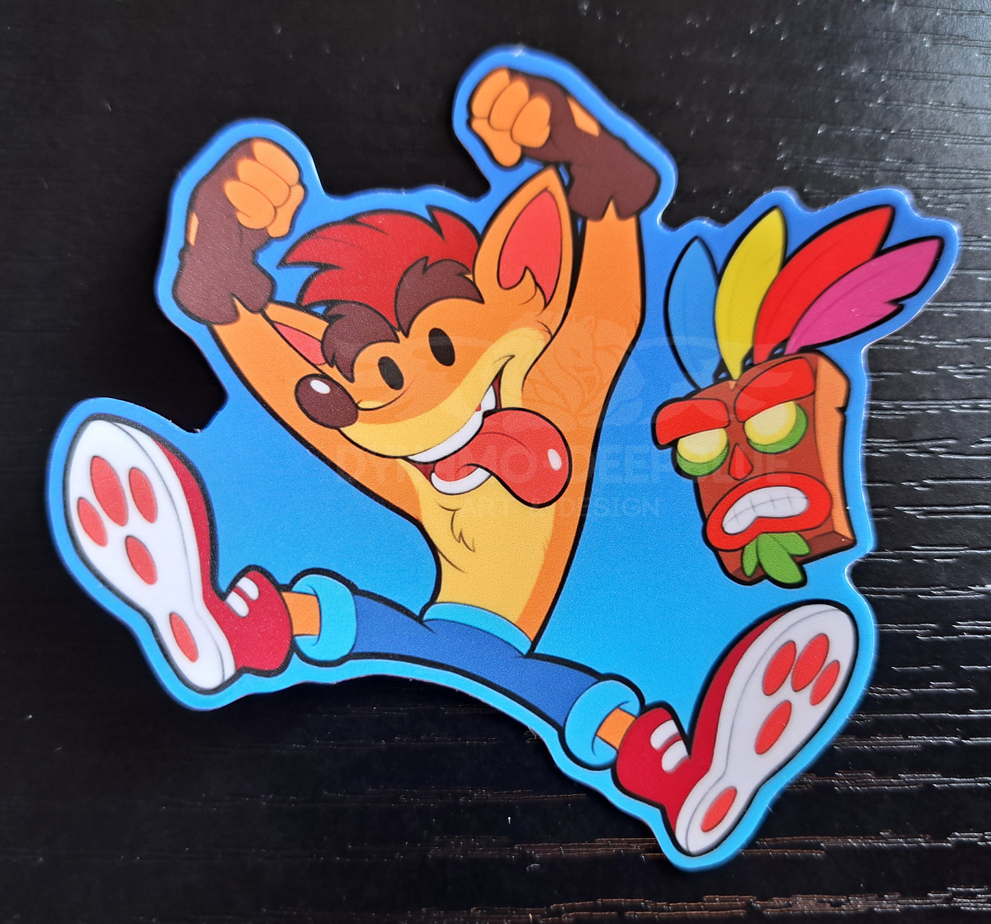 A sticker featuring an illustration of a chibi Crash Bandicoot along with Aku Aku!