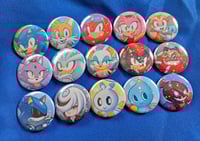 These are pinback buttons featuring artwork of Sonic, Tails, Knuckles, Amy, Cream, Shadow, Rouge, Silver, Blaze, Dr. Eggman, Metal Sonic, Sage, a Neutral Chao, a Hero Chao, and a Dark Chao. Each button has a holographic star finish.