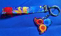 A wrist lanyard that features an illustration of the classic trio against a starry background printed on nylon fabric, and comes with a silver key ring and an acrylic charm inspired by the team formation emblem from the 2003 3D action-platformer game.
